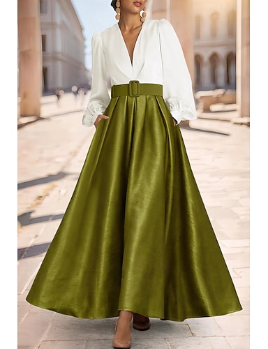 Corte A Hasta el Suelo Vestidos de coctel Vestimenta formal Elegante Bloque de Color Reluciente Manga Larga Escote en Pico Fiesta de jardin Boda Bolsillo Tafetán Satén elástico con Plisado Bolsillo