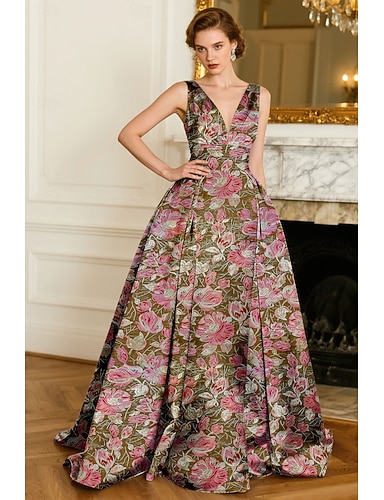Corte A Hasta el Suelo Vestidos de noche Elegante Vintage Sin Mangas Escote en Pico Boda Formal Nailon V Atrás con Estampado flor Bolsillo