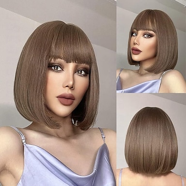 Pelucas marrones de pelo liso corto bob de 14 pulgadas con flequillo lindas pelucas de mujer de fibra sintética para uso diario de cosplay de fiesta de halloween pelucas de fiesta de navidad