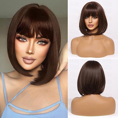 Pelucas Cortas Bob Marrones para Fiesta - Pelucas Sintéticas de Mujer Niña Disfraz de Cosplay Carnaval Cumpleaños Navidad Despedida de Soltera Peluca con Flequillo Pelucas de Halloween