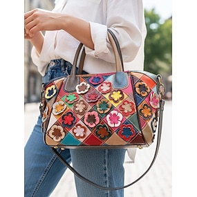 Bolso de mano de piel auténtica para mujer, con múltiples opciones de transporte, decoración floral 3D, elegante y funcional para uso diario u ocasiones especiales.