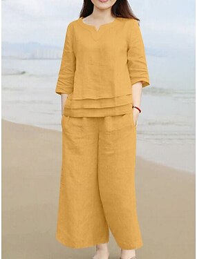 Mujer Conjuntos de pantalones parte superior del bolero Lino de algodón sintético Sin Mangas Cuello Barco Color sólido Plano Moda Ropa de calle Casual Diario Exterior Amarillo Verano Holgado