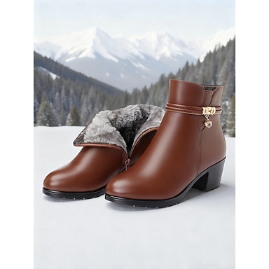 Botas marrones de media pantorrilla para mujer con tacones bajos y cremallera lateral, zapatos casuales de cuero cómodos de moda para uso diario, trabajo &conjuntos de otoño invierno