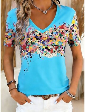 Mujer Camiseta Estampado Graphic Bloque de color Abstracto Vintage Elegante Clásico Manga Corta Escote en Pico Tops regulares Diario Azul Tinta Verano Primavera