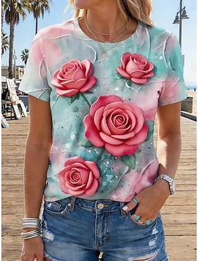 Mujer Camiseta Camiseta superior Estampado Floral Graphic Elegante Clásico Casual Manga Corta Cuello Barco Tops regulares Diario Noche Ropa de playa Azul Piscina Rosa Verano Primavera