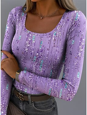 Mujer Camiseta Estampado Graphic Geométrico Vintage Elegante Clásico Manga Larga Cuello Barco Escote Redondo Tops largos Diario Rojo Morado Primavera Otoño