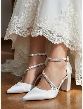Zapatos de boda blancos de tacón cuadrado para mujer: punta puntiaguda con tiras en el tobillo adornadas con diamantes de imitación, calzado de novia elegante para ocasiones especiales