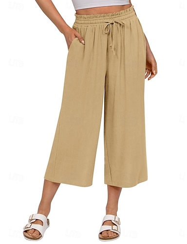 Mujer Lino de algodón sintético Perneras anchas Chinos Pantalones de verano Vacaciones Ropa de calle Casual Longitud total Media cintura Plano Bolsillo Cintura elástica Comodidad Transpirable