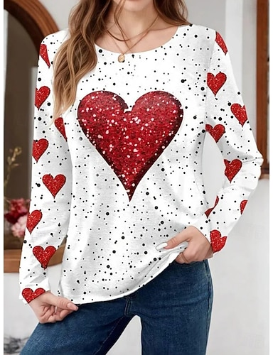 día de San Valentín Mujer Camiseta Estampado Corazón Graphic Moda Elegante Clásico Manga Larga Cuello Barco Tops regulares Diario Fin de semana Blanco Verano Primavera