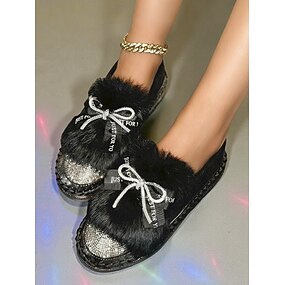Mocasines negros de piel sintética con diamantes de imitación para mujer: cómodos y brillantes zapatos de fiesta sin cordones con detalle de lazo para la vida nocturna.