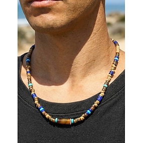 Collar bohemio de cuentas de madera para hombre, gargantilla de cuentas de madera natural y piedra, joyería ligera e informal de estilo resort para hombre, perfecta para uso diario, vacaciones, playa y fiestas.