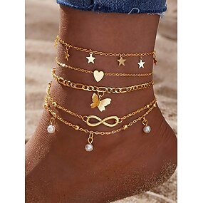 Conjunto de tobilleras chapadas en oro para mujer con dijes de mariposa, corazón, estrella, infinito y perla: estilo bohemio chic ajustable para playa y uso informal.
