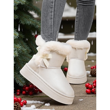 Botas de invierno blancas sin cordones con ribete de piel y detalle de lazo para mujer, elegantes y acogedoras botas de nieve para clima frío y para usar en vacaciones.