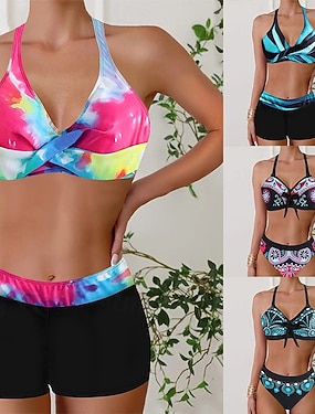 Bikini de 3 piezas para mujer con falda pantalón corto ajustado espalda descubierta ropa de playa de vacaciones floral cuello halter sin mangas manga larga