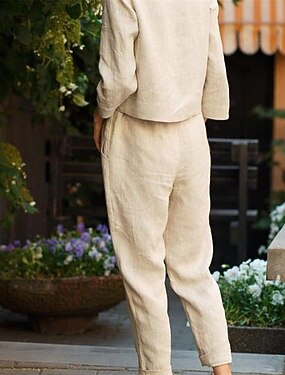 Mujer Conjuntos de pantalones Lino de algodón sintético Manga 3/4 Escote en Pico Color sólido Moda Ropa de calle Casual Diario Exterior Beige Verano Holgado