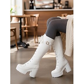 Botas blancas de plataforma hasta la rodilla con cordones, tacón cuadrado y correa con hebilla para mujer: zapatos de moda retro para fiestas, cosplay y salidas nocturnas.