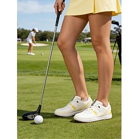Zapatos de golf clásicos blancos/amarillos con cordones para mujer: zapatillas deportivas antideslizantes con amortiguación para golfistas, entrenamiento en campo, partidos de fin de semana, estilo club de campo y caminatas al aire libre.