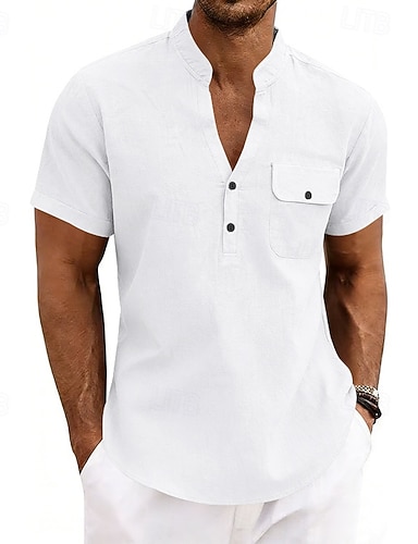 Hombre Camisa Camisa de lino Camisa de verano Ropa de playa Henley Shirt Color sólido Casual Vacaciones Azul Piscina Negro Blanco Azul Marino Manga Corta Escote en Pico Verano Primavera Ropa Bolsillo