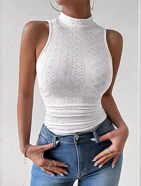 Mujer Blusa con textura Parte superior con ojales Camiseta de punto Blusa Correa Ahuecado Plano Activo Vintage Elegante Sin Mangas Manga Corta Cuello Barco Tops regulares Casual Diario Ropa de calle