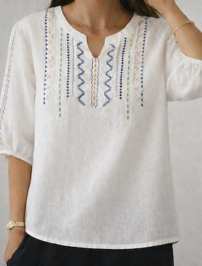 Mujer Camiseta bohemia Camiseta de lino y algodón Camiseta bordada Bordado Vintage Elegante Étnico Media Manga Manga de la linterna Escote en Pico Tops regulares Diario Noche Blanco Rojo Verde Trébol
