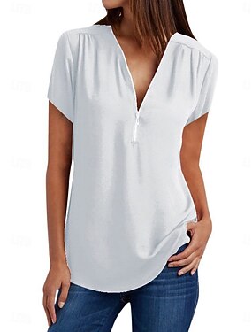 Camiseta de mujer de color sólido básica moderna casual de manga corta con cuello en V tops regulares diarios de fin de semana con cremallera negro blanco rosa vino azul real verano