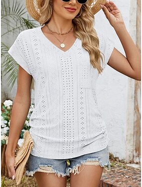 Mujer Camiseta Camiseta superior Ojal Plano Moda Elegante Clásico Manga Corta Escote en Pico Tops regulares Diario Noche Fin de semana Azul Piscina Negro Blanco Rosa Verde Oscuro Verano Primavera