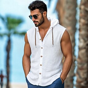 Hombre Camisa Camisa de lino Camisa casual Abotonar la camisa Camisas sin meter en el pantalón Plano Vacaciones Calle Negro Blanco Azul Marino Marrón Sin Mangas Con Capucha Verano Ropa Capucha con