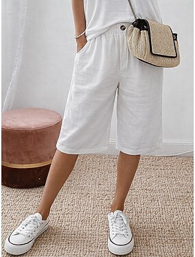 Mujer Pantalón corto Pantalones cortos de lino pantalones cortos de vestir Pantalones cortos de verano Vacaciones Moda Básico Longitud de la rodilla Media cintura Plano Bolsillo Cintura elástica