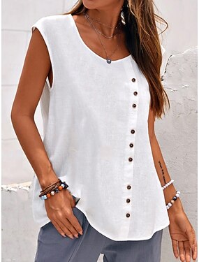 Mujer Camiseta Camisa de lino sintético Camiseta superior Botones Plano Moda Elegante Clásico Sin Mangas Cuello Barco Tops regulares Diario Noche Fin de semana Azul Piscina Negro Blanco Verde Ejército