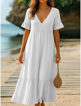 Mujer Vestido Midi Lino de algodón sintético Vestido informal Vestido de Algodón Vestido de una línea Moda Moderno Diario Playa Vacaciones Holgado Plano Manga Corta Escote en Pico Azul Piscina Blanco