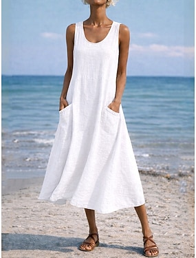 Mujer vestido largo vestido largo Lino de algodón sintético Vestido de cambio Vestido de verano Vestido lencero Elegante Sensual Diario Vacaciones Cita Ajuste regular Plano Sin Mangas Camiseta con