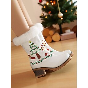 Botines de plataforma de piel sintética blanca para mujer con detalle de lazo y tacón cuadrado: botas festivas para fiestas navideñas e invierno.