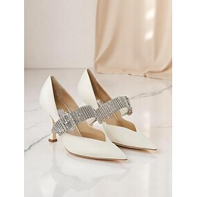 Zapatos de tacón cuadrado con correa al tobillo, de satén blanco y adornados con pedrería. Elegantes zapatos de punta fina para fiestas, bodas y eventos formales.