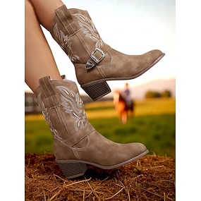 Botas vaqueras occidentales para mujer con diseño bordado y hebilla: botas de tacón grueso hasta media pantorrilla para conciertos de música country, paseos a caballo y atuendos de otoño.