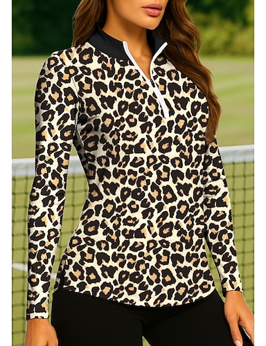 Mujer Leopardo Tops Camisas de polo Camiseta de tenis Tee de tenis Manga Larga Estampado Cremallera de un cuarto Pullover Protección UV Elástico Transpirable Tenis Golf pepinillo Escote Chino Cuello