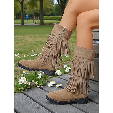 Botas marrones con flecos y borlas superpuestas para mujer: zapatos de media pantorrilla estilo vaquero occidental para festivales de música, conciertos de música country y looks bohemios.