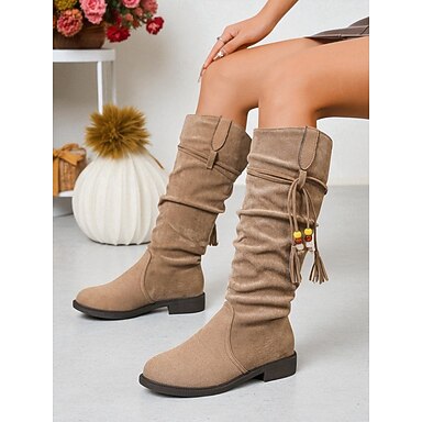Botas altas hasta la rodilla holgadas color caqui para mujer con detalle de borlas: botas de invierno informales de ante sintético para uso diario y festivales.
