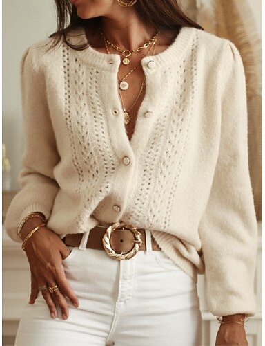 Mujer Cárdigan Elegante Vintage Moda Croché Cuello Barco Ahuecado Manga Larga Tops regulares Tejer Hogar Festivos Cita Beige Primavera Otoño