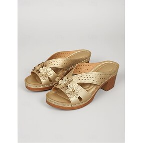 Sandalias planas doradas de tacón de bloque para mujer: sandalias tipo mule perforadas con punta abierta y detalle floral para uso casual en el jardín, vacaciones y uso diario.