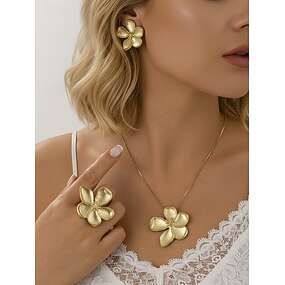 Conjunto de joyería elegante de estilo bohemio para mujer, de 3 piezas: collar y pendientes de aleación. &Anillo con diseño floral en 3D, color oro. &Colores plateados, perfectos para vacaciones,