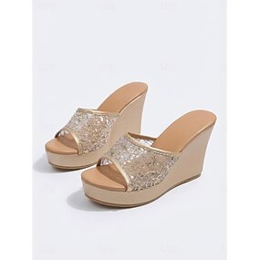 Sandalias de cuña doradas con purpurina para mujer con diseño recortado, correa ajustable, perfectas para fiestas de verano, bodas y eventos nocturnos.