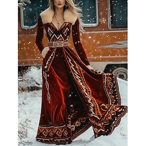 Mujer Vestido maxi Vestido de una línea Casual Diario Ajuste regular Étnico Manga Larga Escote en Pico Vino Otoño Invierno