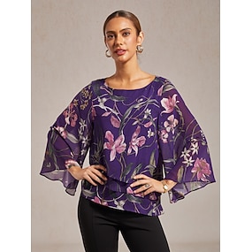 Blusa de mujer de gasa transparente con estampado floral morado oscuro, media manga, dobladillo en capas, cuello redondo, jersey
