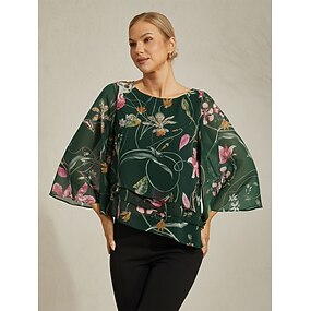 Blusa de mujer de gasa transparente con estampado floral verde, media manga, cuello redondo, dobladillo en capas, estilo informal, elegante, para primavera, verano y otoño.