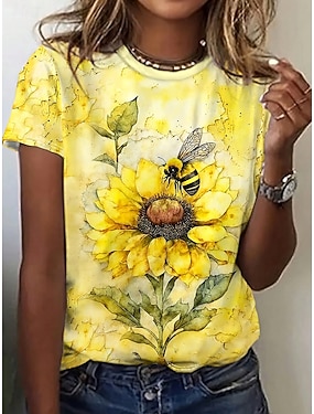 Mujer Camiseta Estampado Floral Elegante Clásico Casual Manga Corta Cuello Barco Escote Redondo Tops regulares Diario Azul Piscina Amarillo Verde Trébol Verano Primavera