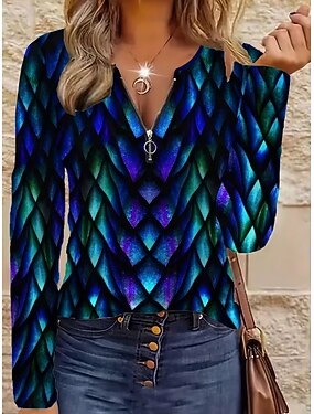 Mujer Camiseta Cremallera Estampado Graphic Geométrico Abstracto Vintage Moda Elegante Manga Larga Cuello Barco Tops regulares Diario Azul Piscina Verde Trébol Primavera Otoño