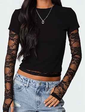 Mujer Camiseta Top de empalme de encaje Y2K Sayo Malla falso de dos piezas Elegante Sensual Casual Manga Larga Cuello Barco Tops cortos Diario Noche Negro Verde Ejército Rojo Marrón Verano Primavera