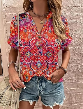 Mujer Camiseta Camiseta superior Botones Estampado Floral Graphic Bohemia Vintage Elegante Manga Corta Escote en Pico Tops largos Diario Noche Fin de semana Azul Piscina Vino Rojo Azul Marino Verano