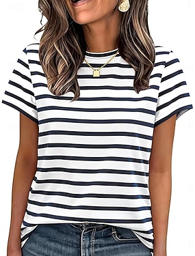Mujer Camiseta Estampado A Rayas Graphic Geométrico Elegante Clásico Casual Manga Corta Cuello Barco Tops regulares Casual Diario Azul Piscina Verano Primavera