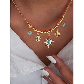 Conjunto de collar y pulsera de aleación de oro para mujer con dijes de sol y árbol en turquesa: joyería boho chic para fiestas, festividades y ropa informal.